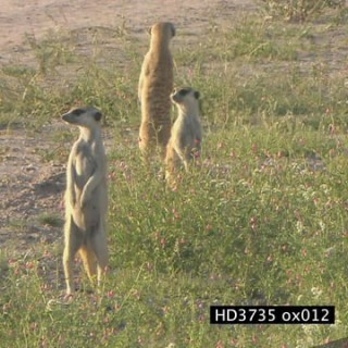 A mob of Meerkats stand erect looking around alert, runs away with tails raised WS