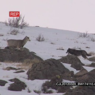 Gray Wolf running around on snowy prairie intimidated by Elk Antelope WS PAN WP