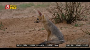 Tracking shot of juvenile cape fox sitting next to the burrow after the rain listening to the sounds around it