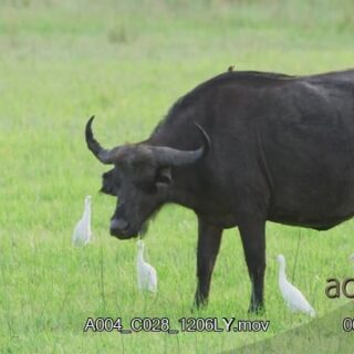 Cape Buffalo followed by Cattle Egret walking, looking towards the camera and feeding on grass.