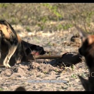 African Wild Dogs Feeding and pulling he kill while the others are sitting on the side looking at them
