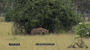 Spotted Hyena Standing Looking, Sniffing around the field and walks past a pack of Wild dogs laying down GOOD LIGHT