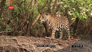 Jaguar (Panthera onca) hunting on riverbank in the Pantanal