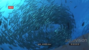 School of Giant Kingfish with Black Triggerfishes swimming in a circle underwater in ocean LA WS HAND