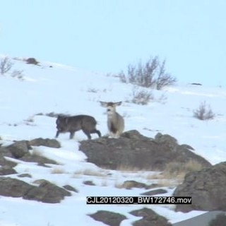 Gray Wolf walking around on snowy prairie and Elk Antelope standing looking at it WS PAN