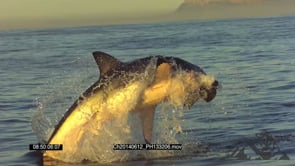 Great White Shark (Carcharodon carcharias), breach out of water attacking seal decoy SLOW AW