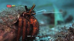 Close up front shot of a red with white dots, giant spotted hermit crab, Dardanus megistos protudes with its face and legs moving out of a shell