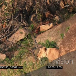 African Lioness standing on bushveld and cubs moving around on rocks LS MS