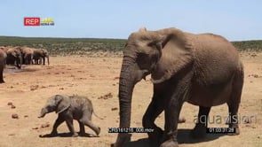 African Elephant herd Walking around with calve running grazing and drinking from the waterhole