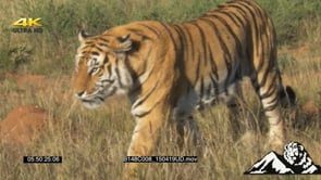 Tiger walking out of frame GREEN LS PAN ZO