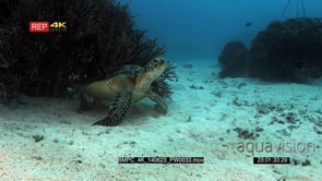 Wide to medium shot of a Green Sea turtle, Chelonia mydas, cleaning its shell by rubbing itself against soft coral.