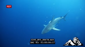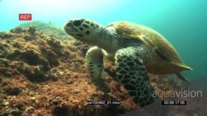 Hawksbill Sea Turtle swimming underwater in ocean deep passing by camera Hunting UW