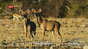 Greater kudu pair standing on the edge of a waterhole