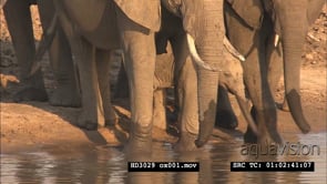 Elephant herd with young calf coming to the river drinking water WS