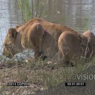 African Lion Pride Laying down with a lioness standing and feeding on a Cape Buffalo Kill BLOODY