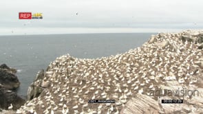 Northern Gannets colony breeding on cliff overlooking the Atlantic ocean