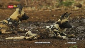 African Wild Dog pair lying near mud