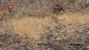 Leopards walking then standing and looking around on burnt bushveld WS PAN HAND