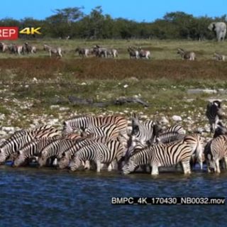 Large Dazzle of zebra drinking water while rest of the herd walking away, male elephant walking towards the river