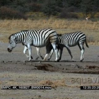 Zebra herd around dry waterhole WS