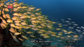 A large school of bluelined snapper fish and scissor-tailed fusilier’s caesio caerulaurea HUNTING in the ocean