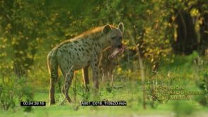 Spotted Hyena with piece of meat walking into the bush