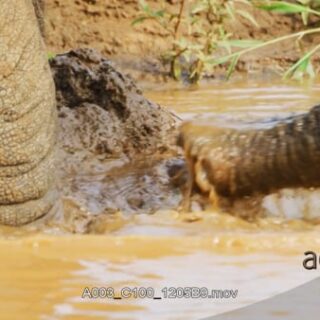 African Elephant mud bathing and splashing water with its trunk.
