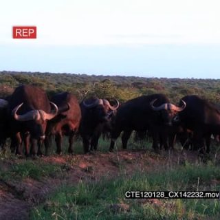 Cape Buffalo herd standing on bushveld looking at camera WS