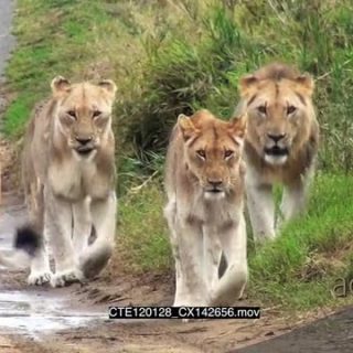 Lion pride walking towards camera