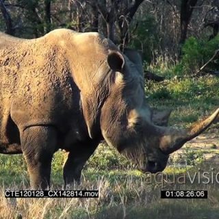 White Rhino moving and grazing on bushveld and an African Lion laying down Stalking WS