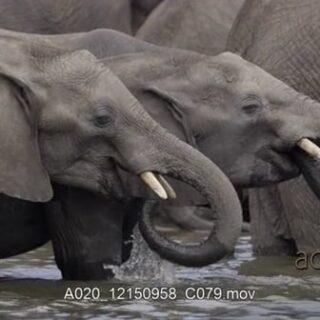 Courtship display of African Elephant herd with calves side view, drinking water at the same time.