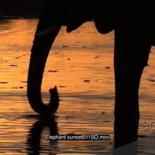 African Elephant bull in silhouette drinking from river at sunset during dusk.