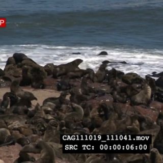 Tilt shot of hundreds of the cape fur seal colony at cape cross Namibia frolicking in the Atlantic ocean to the rest of the colony nursing babies on the beach
