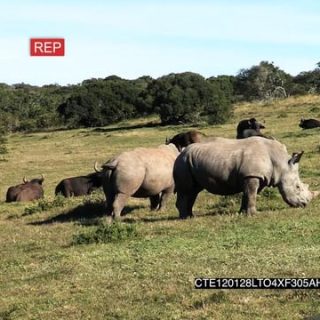 White Rhinos standing grazing on grassland and Cape Buffalo herd laying down LS