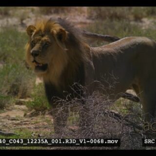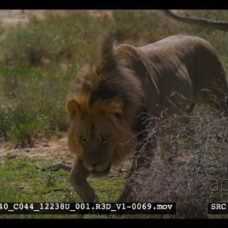 Close tracking shot of male lion smelling the ground around a tree that he had just marked with his scent