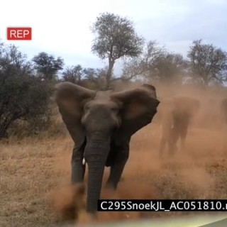 Three young Elephants charge vehicle Jeep, Two mock charge and one charge and hit car with force