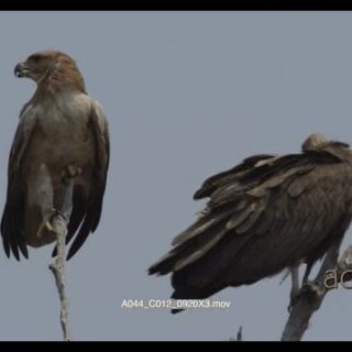 Tawny Eagle and Hooded Vulture standing on tree then eagle flying away LA 2S MLS