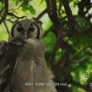 Verreaux’s eagle-owl sitting on large sheltered branches and looking towards the camera.