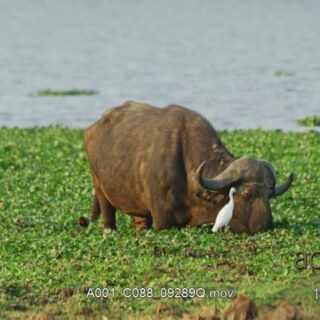 Cape buffalo walking among and feeding on the nile cabbage.