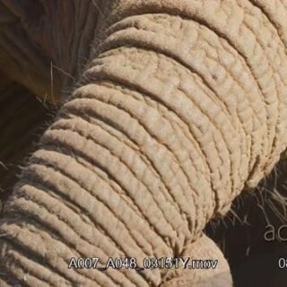 Muddy White rhinoceros standing, chewing grass and walking away from the frame.