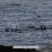 Cape gannets flying over ocean tilt down Cape fur seals playing swimming in water