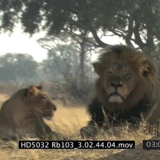 African Lion sub-adult male walks towards Lion pride laying down, Adult male Lion (Cecil) falls asleep; LS MS CU