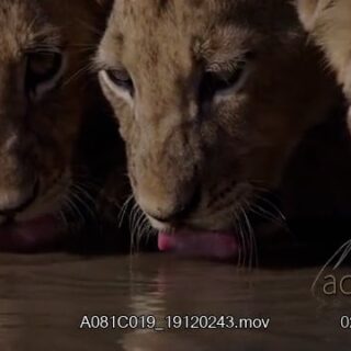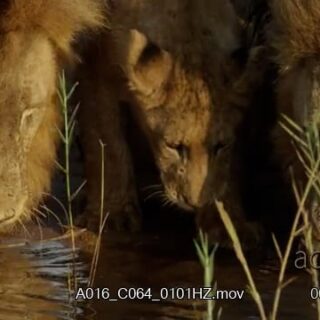 Two Male African Lion and two cubs crouching while drinking water.