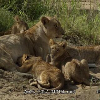 Adult African Lioness laying, grooming cubs, resting and one suckling from her.