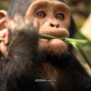 Chimpanzee holding onto tree looking down. Medium shot.