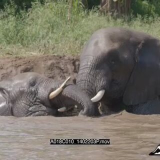 Two adult African Elephants play fighting in the river.