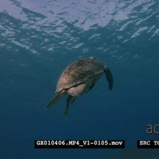 A tracking shot of a Dugong swimming down to a green sea turtle and holding onto it, all the way up to the surface.