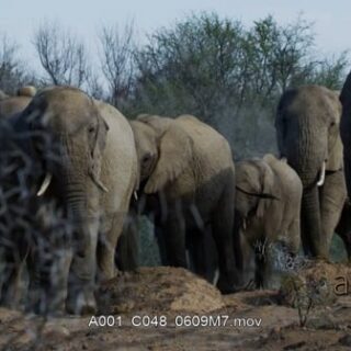 Herd of young and adult African Elephant running pass by the frame.