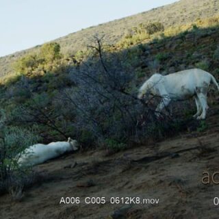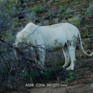 Male White lion standing, feeding on a hunted carcass and female Lioness laying down.