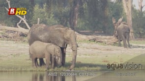 Select options DownloadThree adult female of African Elephant and young calf drinking water and one defecating, WS;MORNING